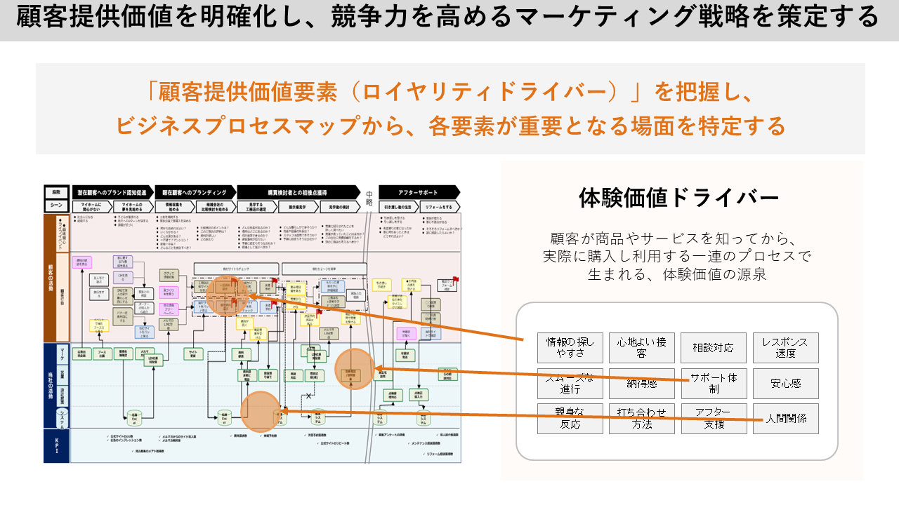 複数の関係者が顧客接点を持つようなビジネスモデルの場合、自社側の活動プロセスも含むビジネスプロセスマップを作成することで、部門横断的に顧客体験を高める改善点がより効果的に導き出せます。