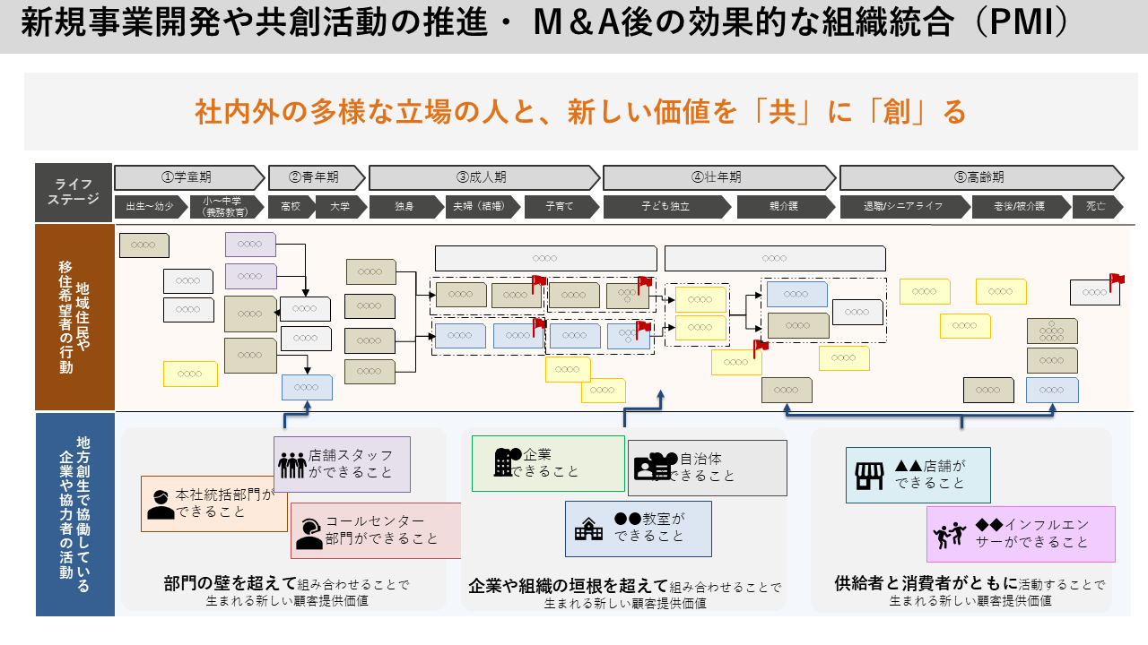基本的にはビジネスモデルが異なるものは分けて作成します。ただし、自社として事業部は分かれていても、顧客層が重なる場合は、顧客視点に立って一緒に一枚のプロセスマップを作ってみることが、新たな施策発見に有効です。